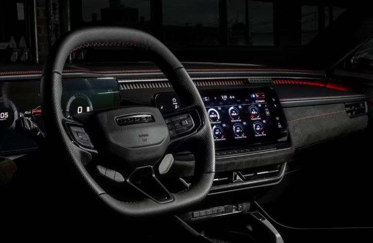 The cabin blends muscle-car attitude with modern technology and comfort. A curved digital instrument cluster clearly displays navigation, performance data, and safety alerts. The 12.3-inch touchscreen supports wireless Apple CarPlay®, Android Auto™, and over-the-air updates.