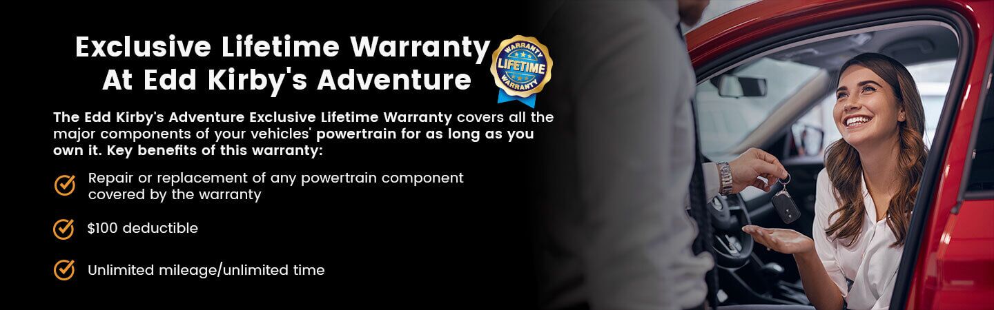 The Edd Kirby's Adventure Exclusive Lifetime Warranty covers all the major components of your vehicles' powertrain for as long as you own it. Check out the key benefits of this warranty below: